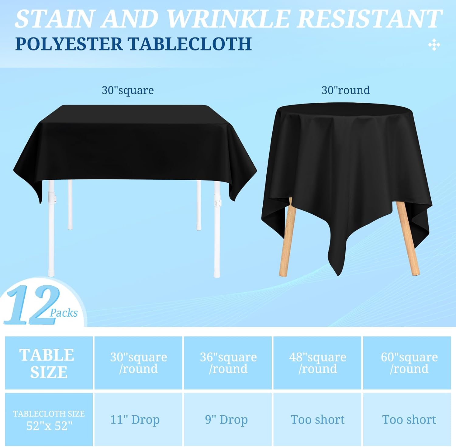 12 Pack Black Square Tablecloths 52 x 52 Inch, Table Cloth for Square Table, Stain and Wrinkle Resistant Washable Fabric Table Cloth, Polyester Tablecloth for Restaurant Banquet Party