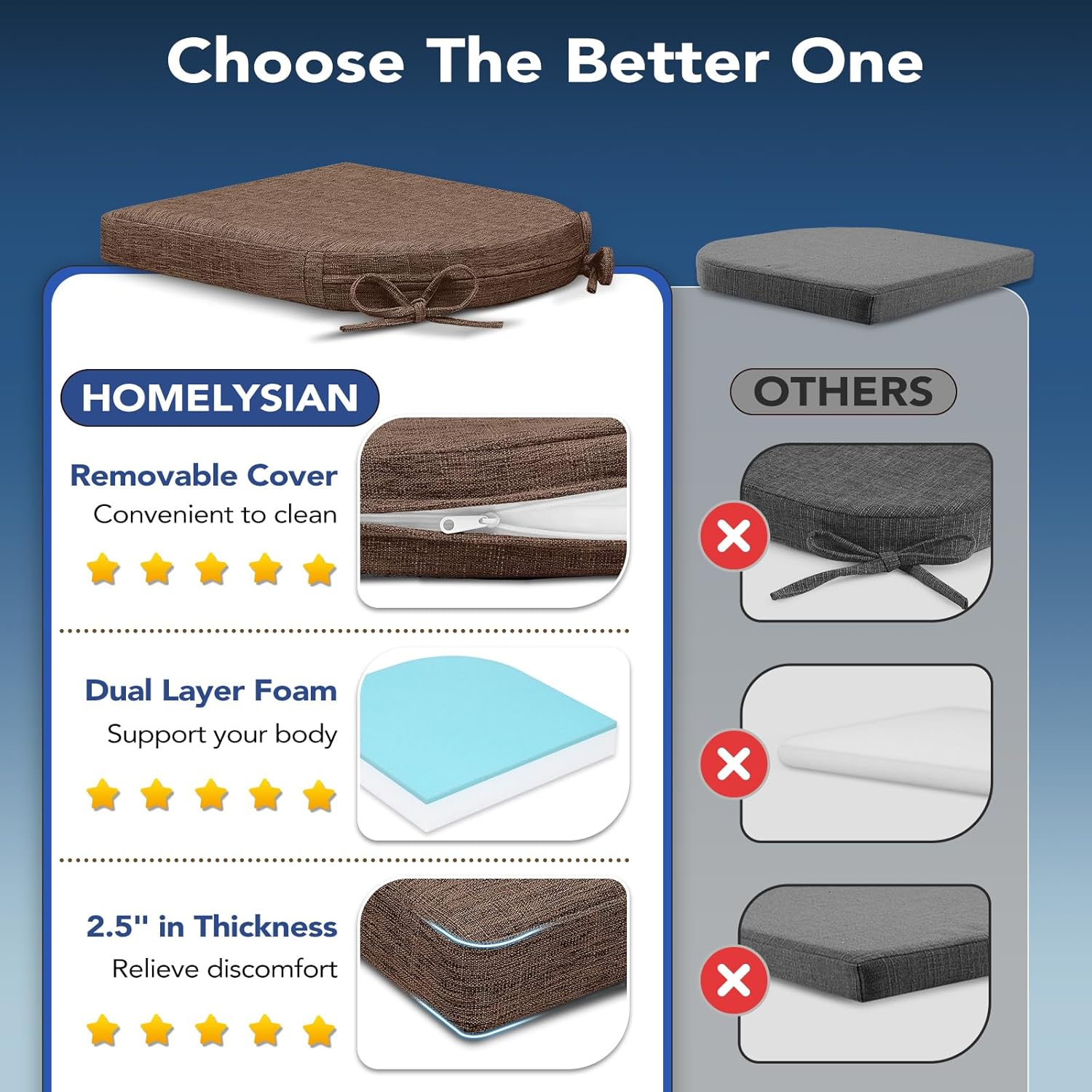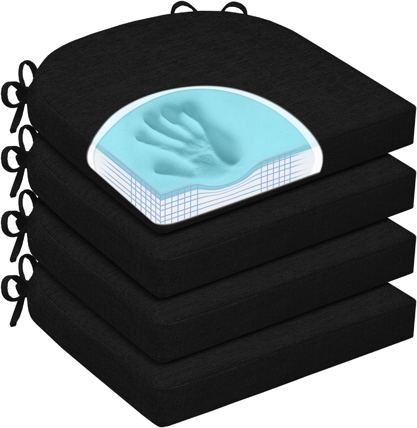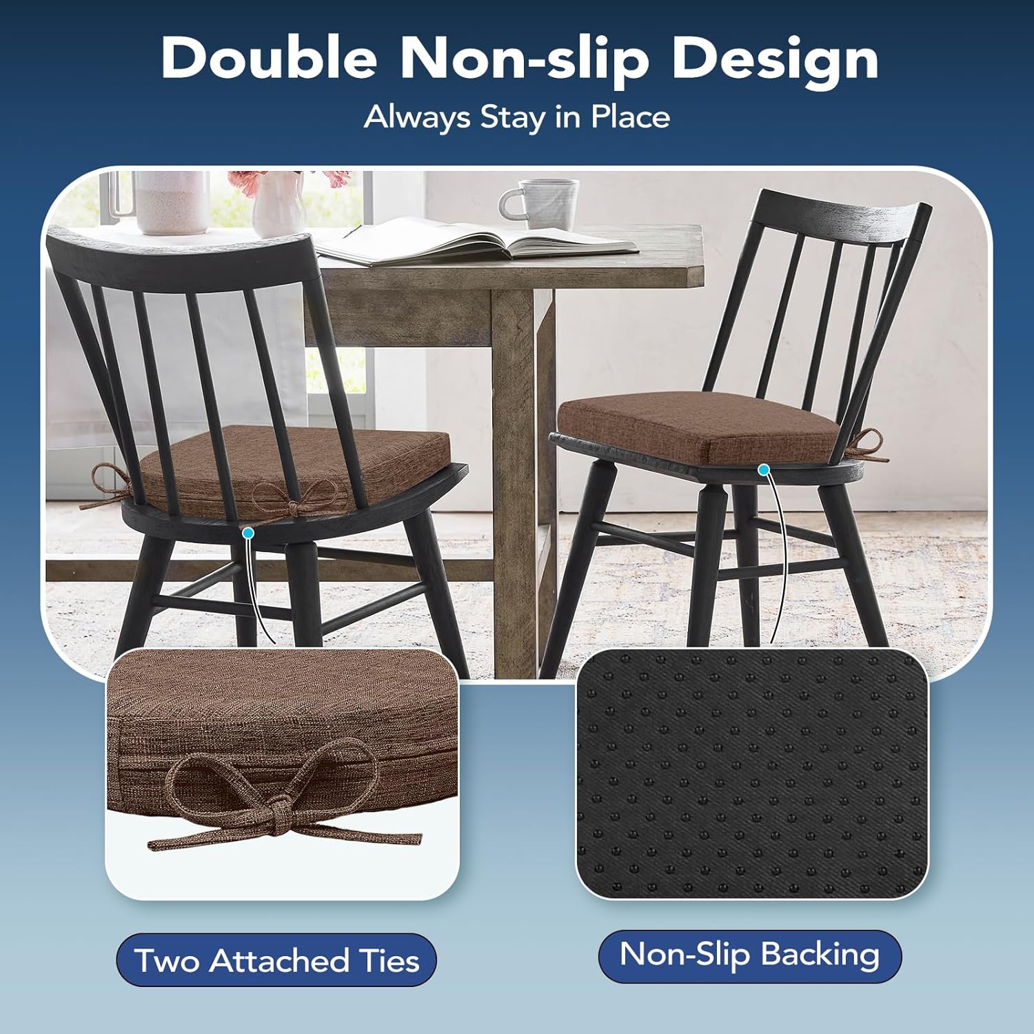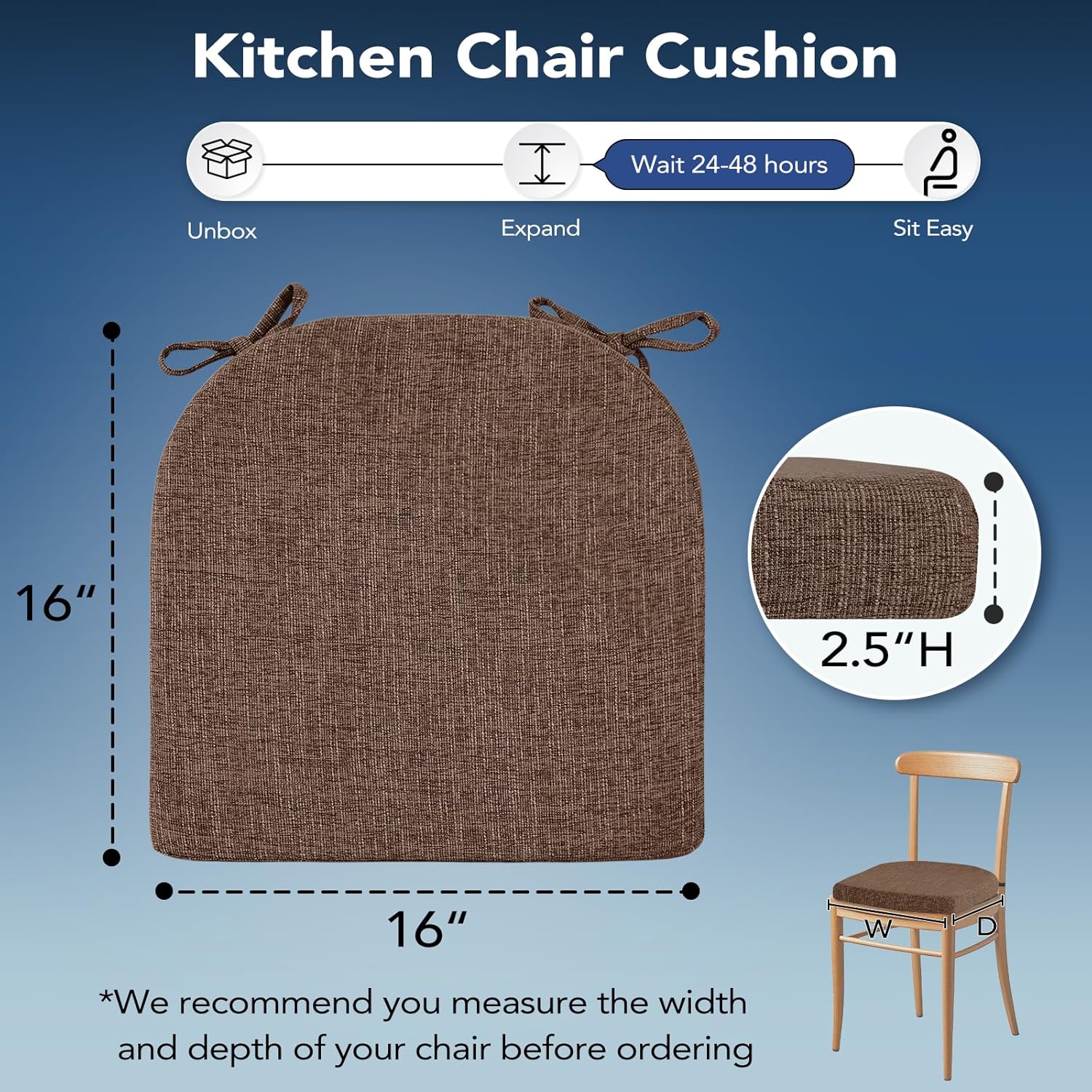 Chair Cushions for Dining Chairs, Non Slip Chair Pads with Ties and Washable Covers, Memory Foam Kitchen Chair Cushions Set of 6, 16"X16"X2.5", Brown